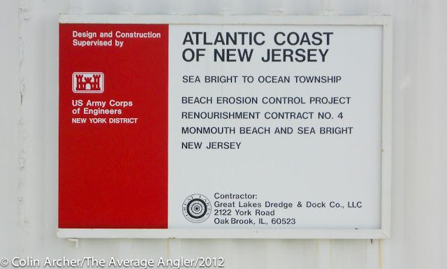 ......the US Army Corp of Engineers is pumping 13,000,000 (thirteen million dollars!) of sand up onto the beach. Today I visited the site where work has been in progress for about a month. It started shortly after Sandy hit and is currently happening across from the U.S. Live Saving Station. It was a scheduled "Beach Renourishment" project that was in the works for a year. It is the second phase, with the first 12,000,0000 (twelve million dollars) phase completed last January. That first phase went from Little Monmouth beach club to the rocks north of Big Monmouth beach club. That sand is either on the other side of Ocean Avenue now, or washed back into the ocean. The second or current phase, is pumping sand from where the first phase ended north of Big Monmouth and continuing into Sea Bright, around where the destroyed Driftwood Cabana Club is now resting on the sea wall.