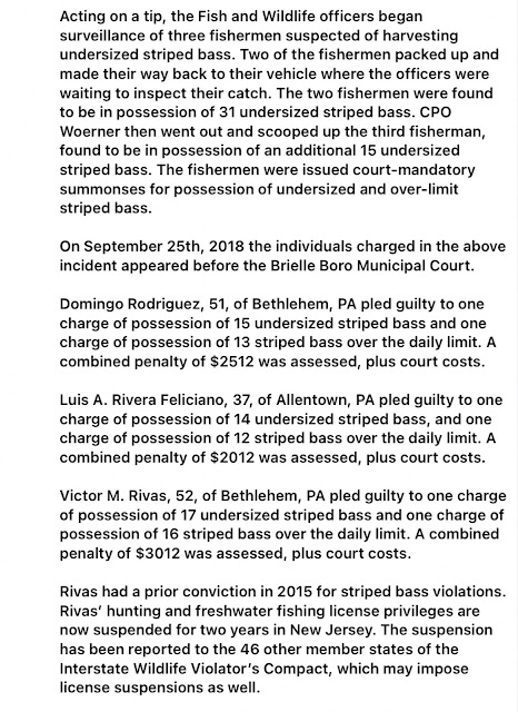 These fellas paid fines of $2,512, $2.012, and only $3,012 for the repeat offender Rivas. I won't get into anything political, but I find it funny that when you apply for a fishing license or permit in the State of New Jersey they ask if you are in good standing and have to complete the Child Support Certification. If you are not, you breaking the law, and cannot have the privilege of hunting and fishing. But if you are arrested, charged, and convicted of a crime against wildlife they don't ask or investigate if you may be in violation of any other laws in this state or country....I don't get it.