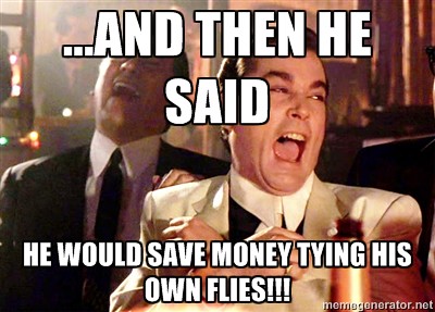 Next you'll have to ask yourself what are you going to use the vice for. Home vs travel? Pedestal base vs c-clamp? Tying midges vs Beast Fleyes? Or are you looking to do it all, so does the company have a varied interchangeable jaws? True rotary vs fixed? And then, how much can you invest in this endeavor. Just some advice, look at the meme below, it'll tell you the true story.