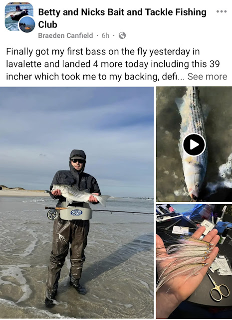 And just when I talked myself out of fly rod opportunities hats off to Braeden Canfield who fished in the cold and caught his first batch of striped bass on the fly including a 39 inch fish that ate his Flatwing fly. It looks like next week it warms up a bit after this cold snap. With water temps around 50, and bait and fish around, and good fish still on the move, maybe it's not over after all.